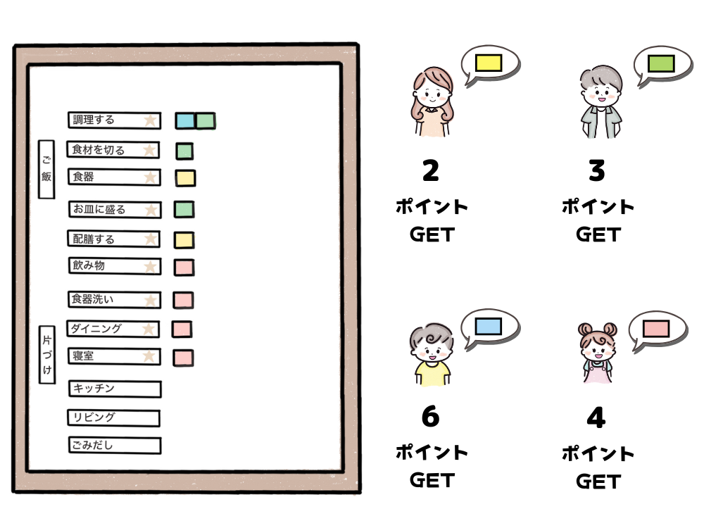 家事ボードをリビングに置いて、家事分担を家族みんなが見えるようにしたら、子どもがやりがいを感じたのか積極的にお手伝いをしてくれるようになりました。