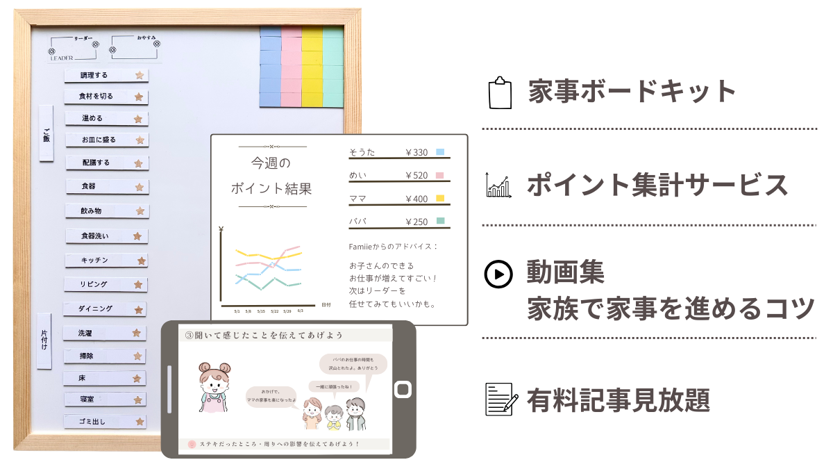 Famiie ファミー– 家族で暮らしづくりを楽しむサービス – 詳細 家事ボードキット ご家庭に合わせた家事分担でオリジナルのボードが作れます 家事シールやカラフルなマグネット、家族で楽しめるガイダンス付き! ポイント集計サービス 家族全員の家事獲得ポイント・週次のグラフ化、アドバイスを作成します 稼いだポイントはお小遣いに換算できます 家族で家事を進めるコツ動画集 家事ボードを使った家事の進め方を解説 家族への声かけや関わり方のコツ・片付く家づくりを30以上にわたる動画で紹介 次の画面「請求書の住所」は家事ボードキット送付先の住所をご入力ください(番地・マンション名・部屋番号も明記) 家事ボードキット全国送料無料 期間限定価格は2026年3月末まで